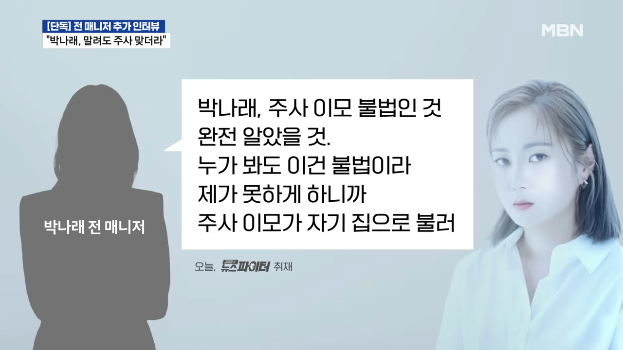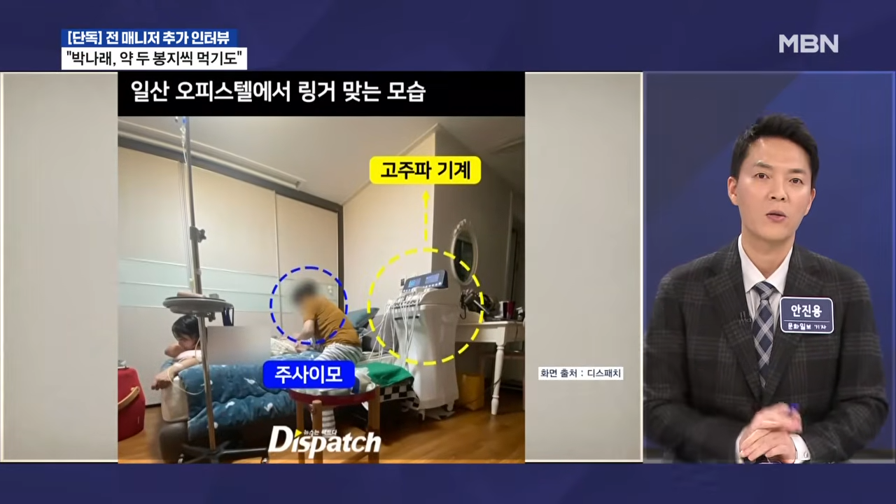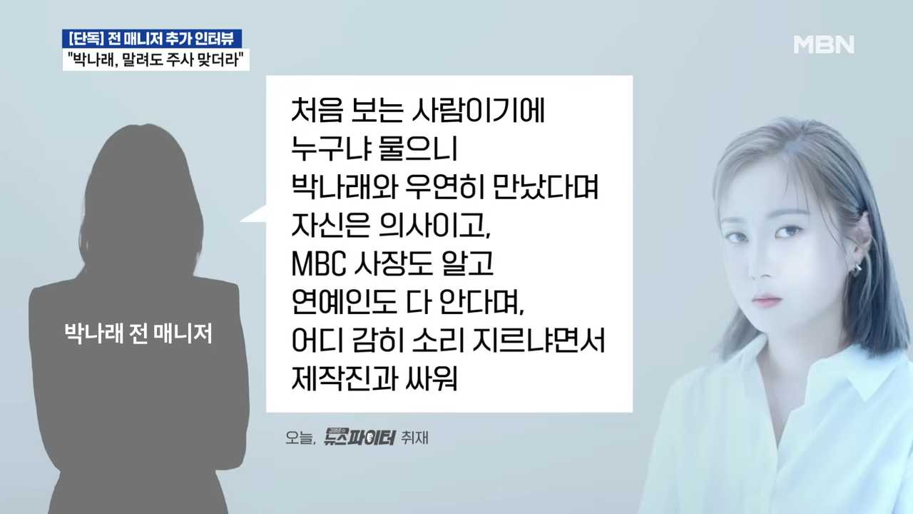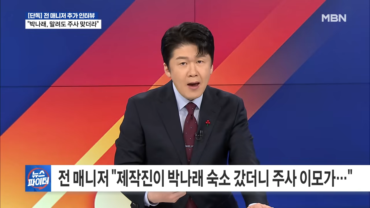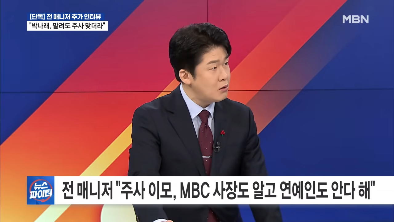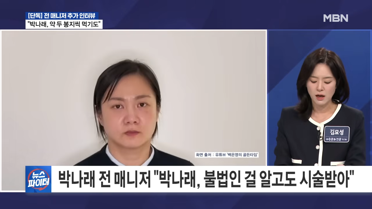 박나래의 前 매니저 A씨는 최근 MBN ‘뉴스파이터’에 출연해 박나래 관련 약물 의혹을 구체적으로 폭로했습니다.