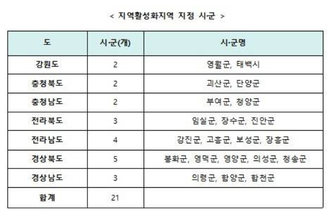 이번에 지정된 지역은 비수도권 7개 도, 총 21개 시군입니다.